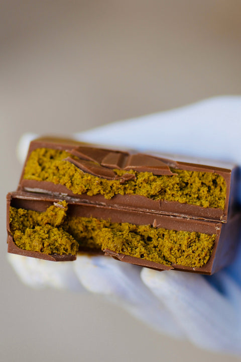 A 100% artisanal Swiss chocolate tablet with 38% Venezuelan milk chocolate, Iranian pistachios, buttery biscuit crunch, and edible gold.